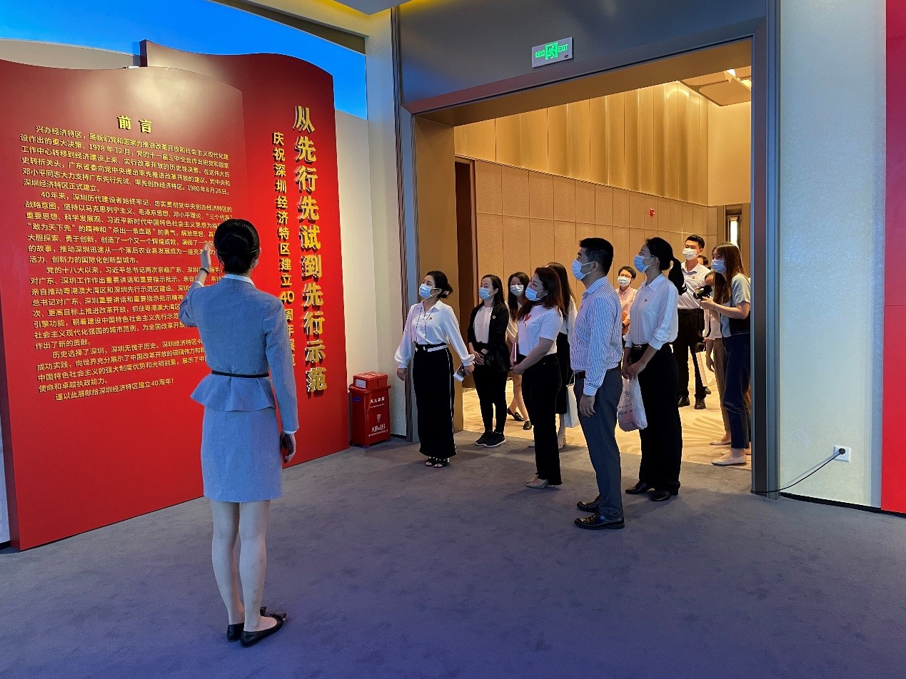 两党支部一行首先参观了前海国际会议中心和“从先行先试到先行示范——庆祝深圳经济特区建立40周年展览”,跟随讲解员了解其传统与现代手法相融合的建筑设计理念,体会到了“彩云追月”岭南文化的传统韵味和前海地域新时代的气息,感受到了深圳前海发展取得的辉煌成就,同时重温了总书记重要指示精神,学习党史、深圳经济特区发展史,激发党员干部的拼搏精神。