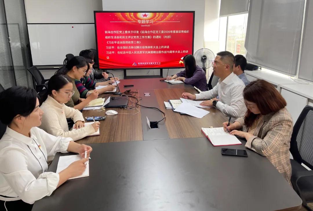 首先,雷振锋同志传达了上级党委指示精神,带领大家集中学习了《前海合作区党工委2020年度基层党组织组织生活会和民主评议党员工作方案》,并对3月份党建工作进行部署。