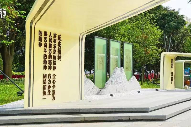景廊前方中心位置设以延安地貌造型的主题雕塑,结合新中式的设计手法,生动的展现了延安当时的环境条件。组雕对面设有长椅,让游览者休憩同时仔细赏析景廊立面的诗词。