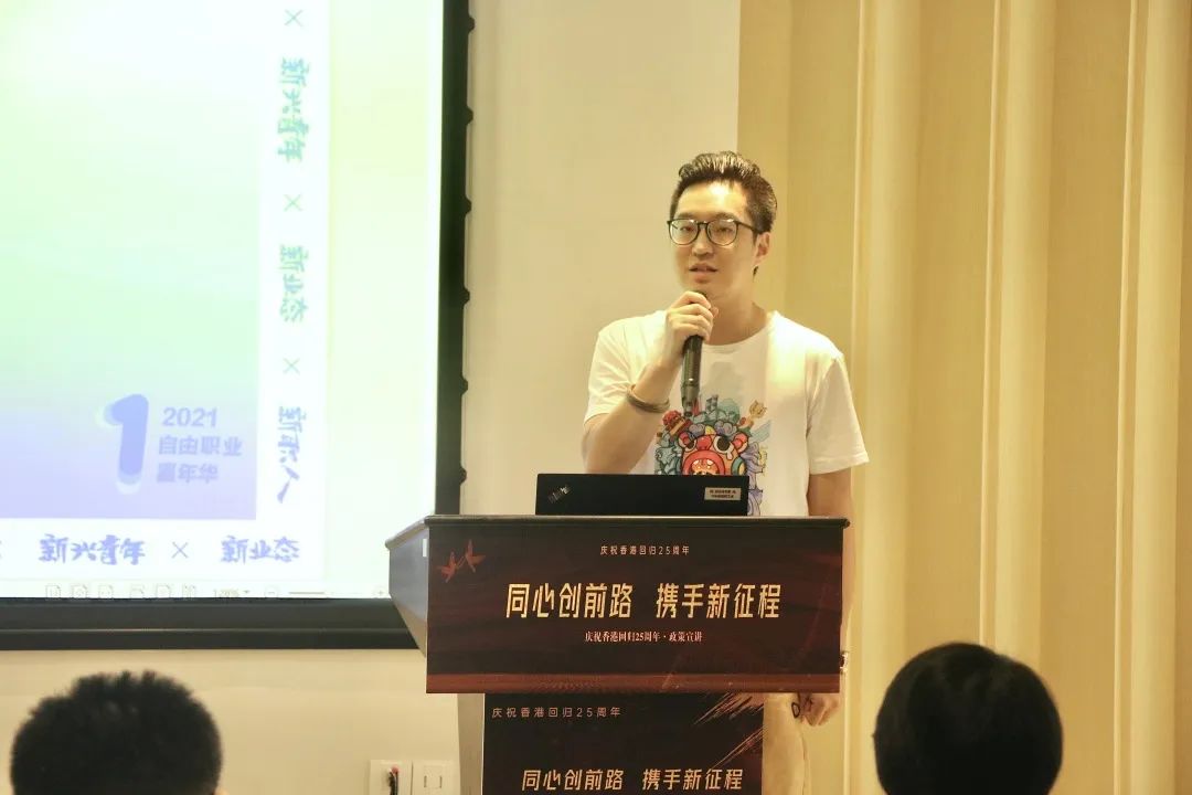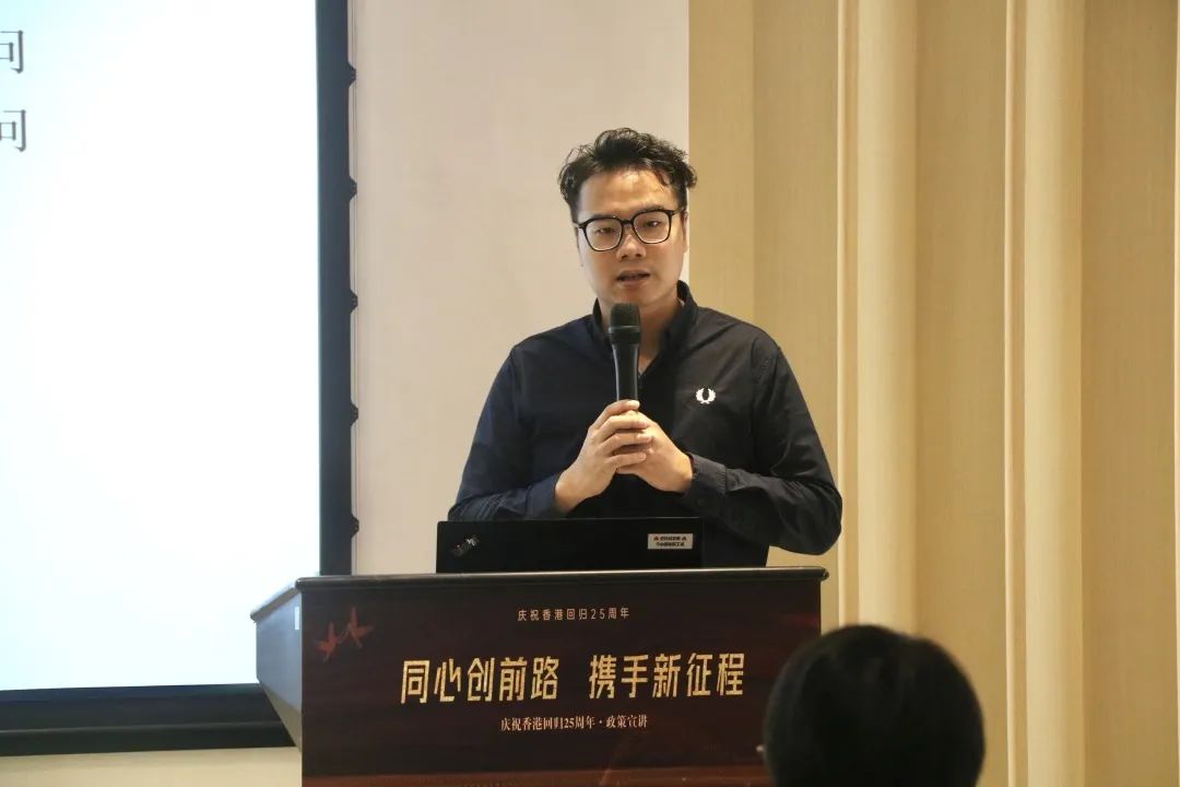 大湾区青创中心入驻的香港青年企业家郑卓斌先生作为优秀香港青年代表为在场嘉宾从日常生活、住房、就业、创业、政策补贴五大方面进行创业经验分享。他表示,香港25周年,习近平主席发表的重要讲话对香港青年来说是一支强心针。