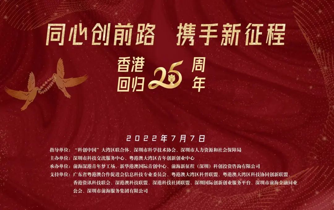 本次活动由“科创中国”大湾区联合体、深圳市科学技术协会、深圳市人力资源和社会保障局作为指导单位,深圳市科技交流服务中心、粤港澳大湾区青年创新创业中心作为主办单位,前海深港青年梦工场、新华港澳国际青创中心、前海新征程(深圳)科创投资咨询有限公司作为承办单位,广东省粤港澳合作促进会信息科技专业委员会、粤港澳大湾区科普联盟、粤港澳大湾区科技协同创新联盟、香港资讯科技联会、深港澳科技联盟、深港科技社团联盟、深圳国际创新创业服务平台、深圳市前海服务集团有限公司、深圳市前海金融同业公会作为支持单位。