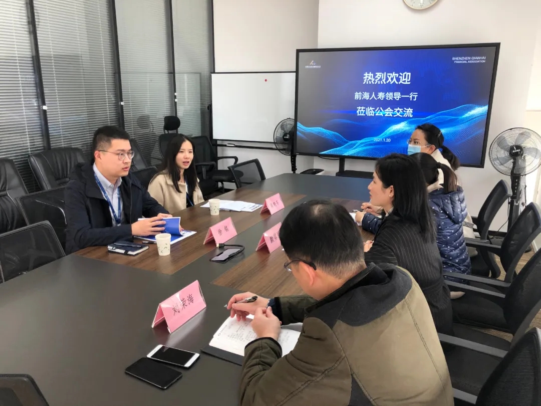 1月20日下午,前海人寿保险股份有限公司(下称“前海人寿”)综合管理部行政负责人蒋晓菲、徐铭到访深圳市前海金融同业公会(下称“同业公会”)交流,同业公会刘荣海、颜雪丽及会员服务部同事出席接待。