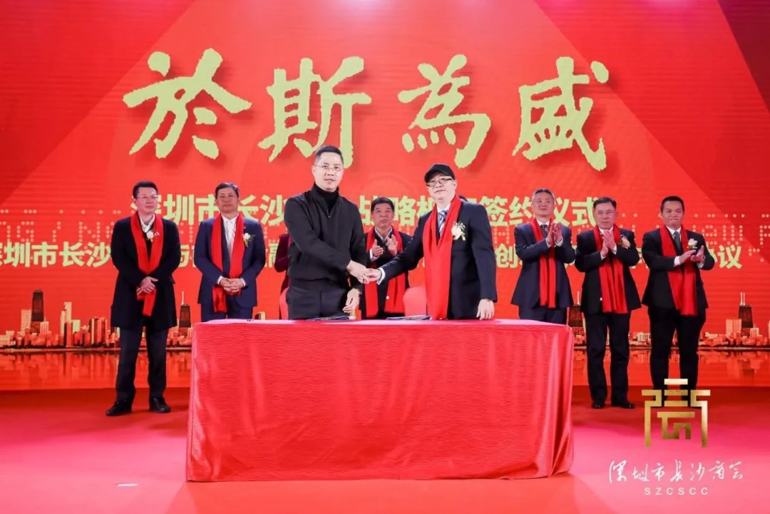 2021年1月10日,深圳市前海金融同业公会(下称“同业公会”)与深圳市长沙商会(下称“长沙商会”)在中国(湖南)自由贸易试验区长沙片区推介会暨于斯为盛·深圳市长沙商会2021年迎新春联谊(晚宴)上签署战略合作协议。深圳市前海金融同业公会秘书长雷振锋先生、深圳市长沙商会执行会长兼秘书长刘凤萍先生代表双方签署协议。长沙市人民政府副秘书长厉江华先生,长沙市人民政府驻深圳办事处主任齐益主任,长沙市商务局副局长孙春华先生,长沙市工商联副主席刘立红女士,深圳市前海金融同业公会会长李剑峰先生、深圳市长沙商会会长及常务副会长等领导在台上出席签约仪式,大湾区湖南籍企业家代表与商协会领导共同见证签约。