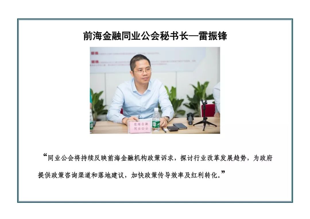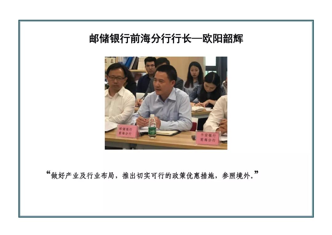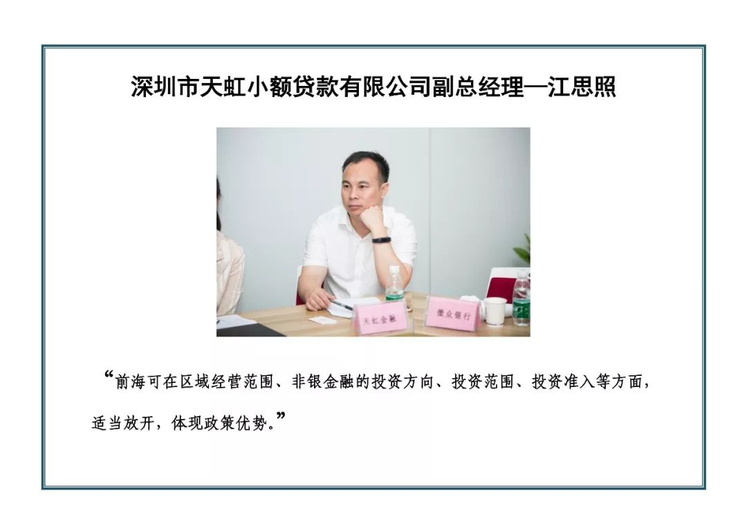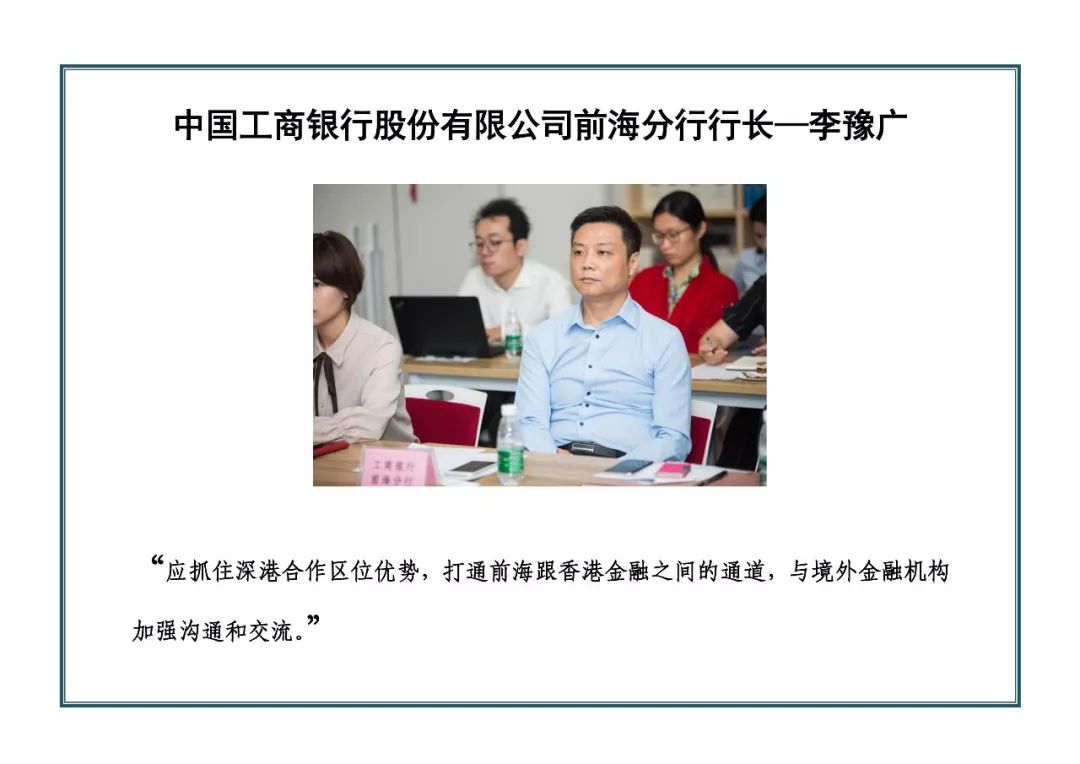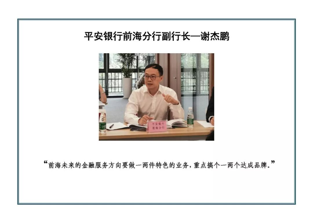 前海金控、前海开源基金、华融前海财富管理、前海再保险、弘毅投资、浦东银行前海分行、招商财富资产管理、东亚银行前海分行、中国银行前海蛇口分行、工商前海分行、平安银行前海分行、微众银行、邮储银行前海分行、玉山银行、天虹小贷、中顺易金融服务、华融融德、深圳前海股权交易中心等18家前海金融机构负责人参加座谈。