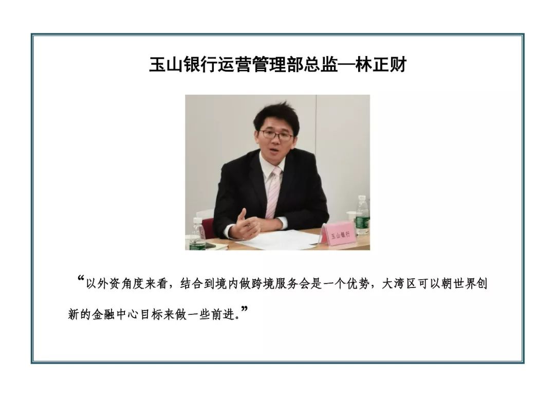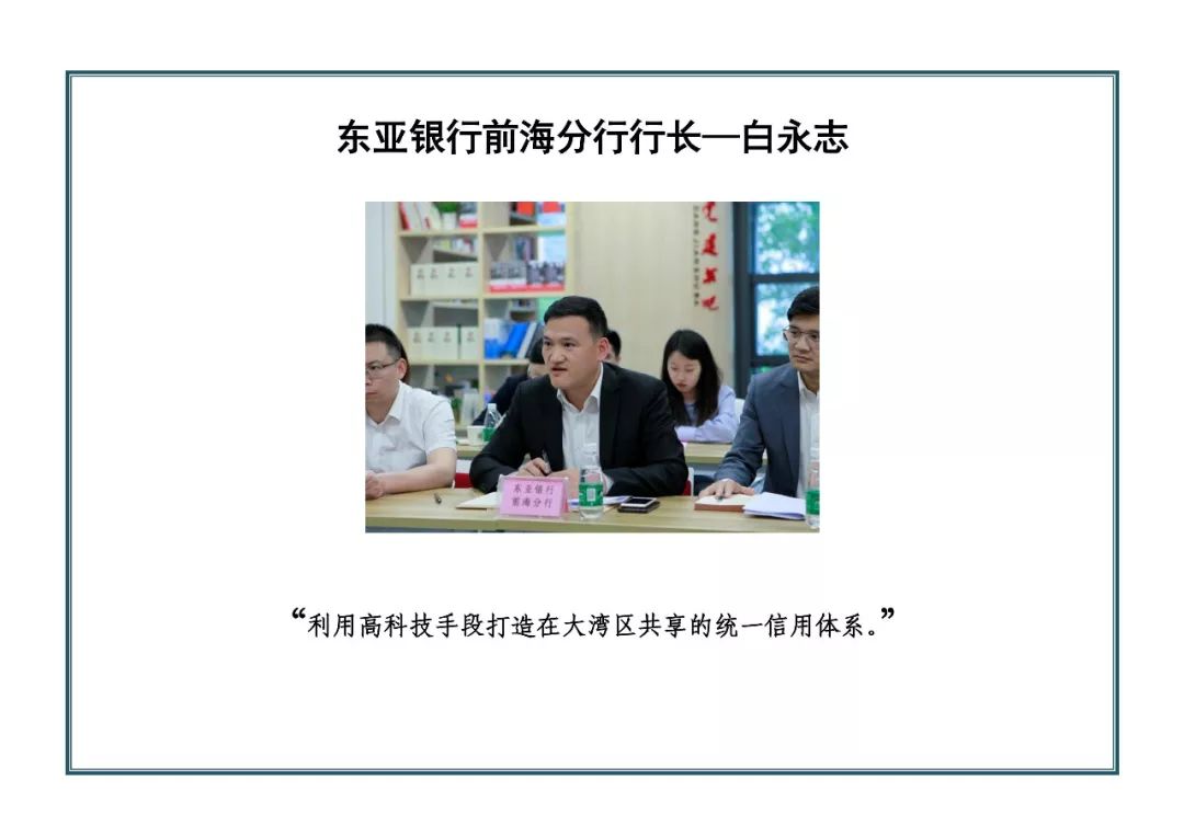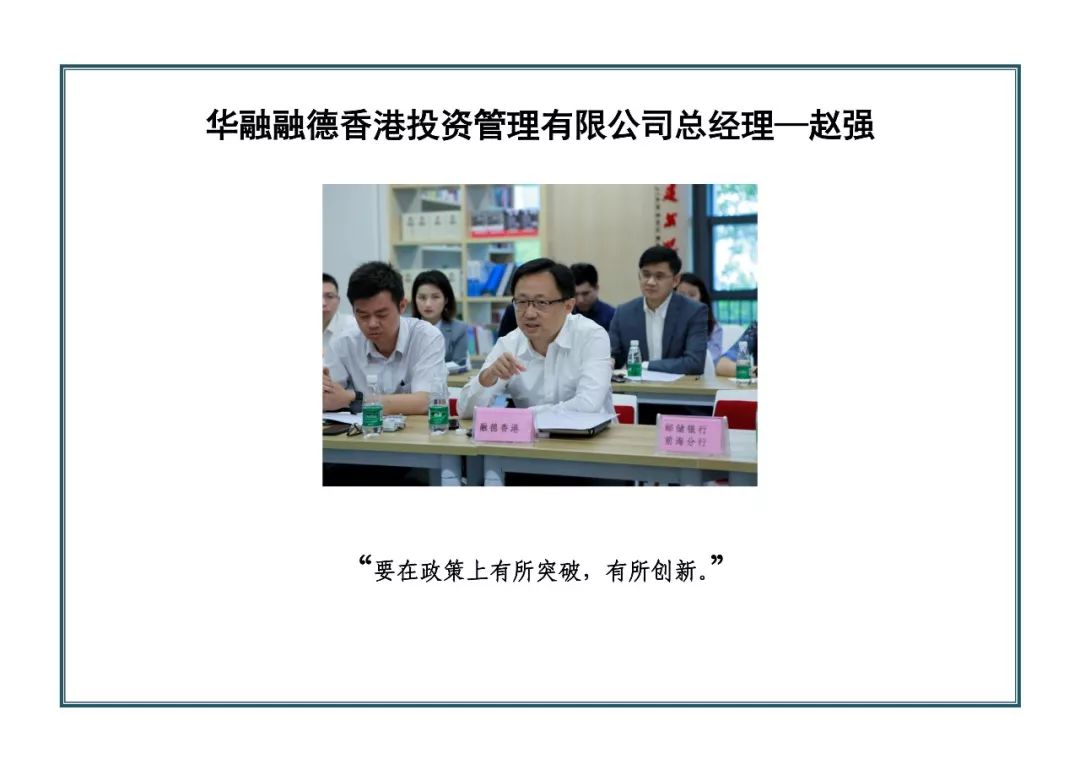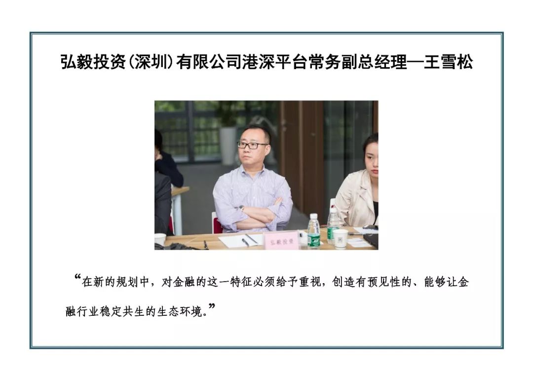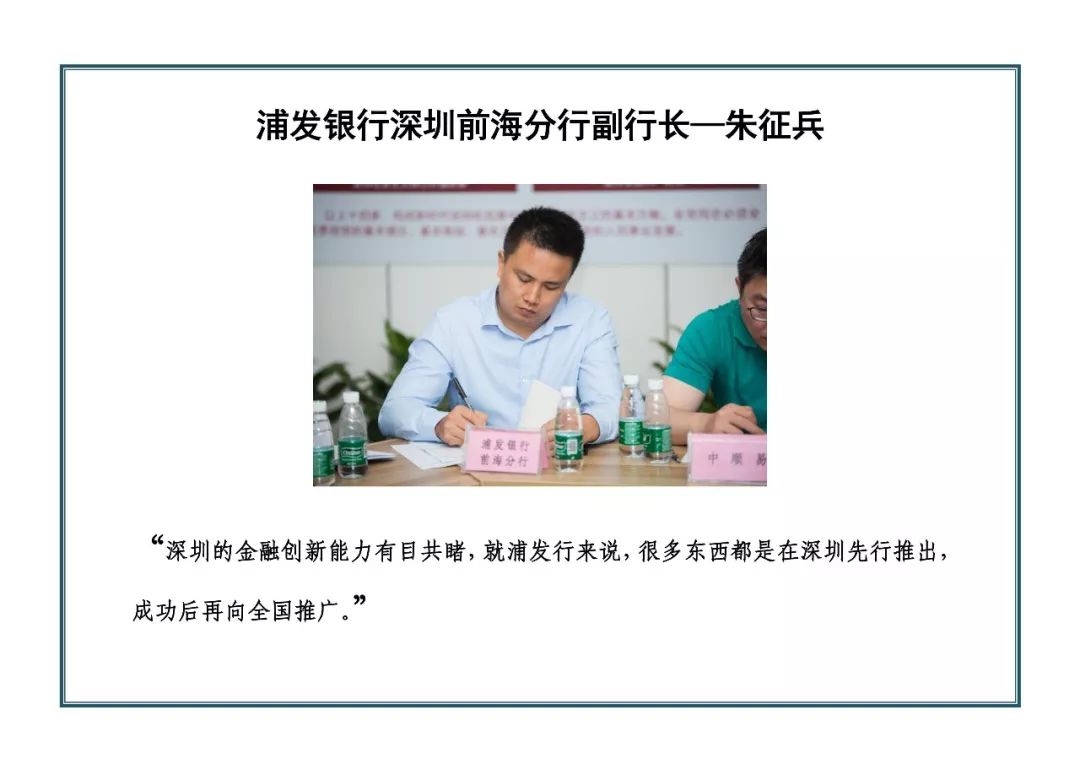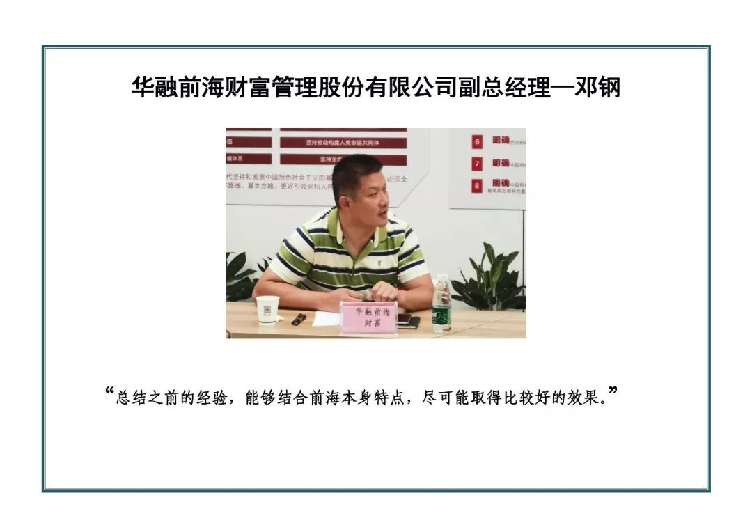 前海金控、前海开源基金、华融前海财富管理、前海再保险、弘毅投资、浦东银行前海分行、招商财富资产管理、东亚银行前海分行、中国银行前海蛇口分行、工商前海分行、平安银行前海分行、微众银行、邮储银行前海分行、玉山银行、天虹小贷、中顺易金融服务、华融融德、深圳前海股权交易中心等18家前海金融机构负责人参加座谈。