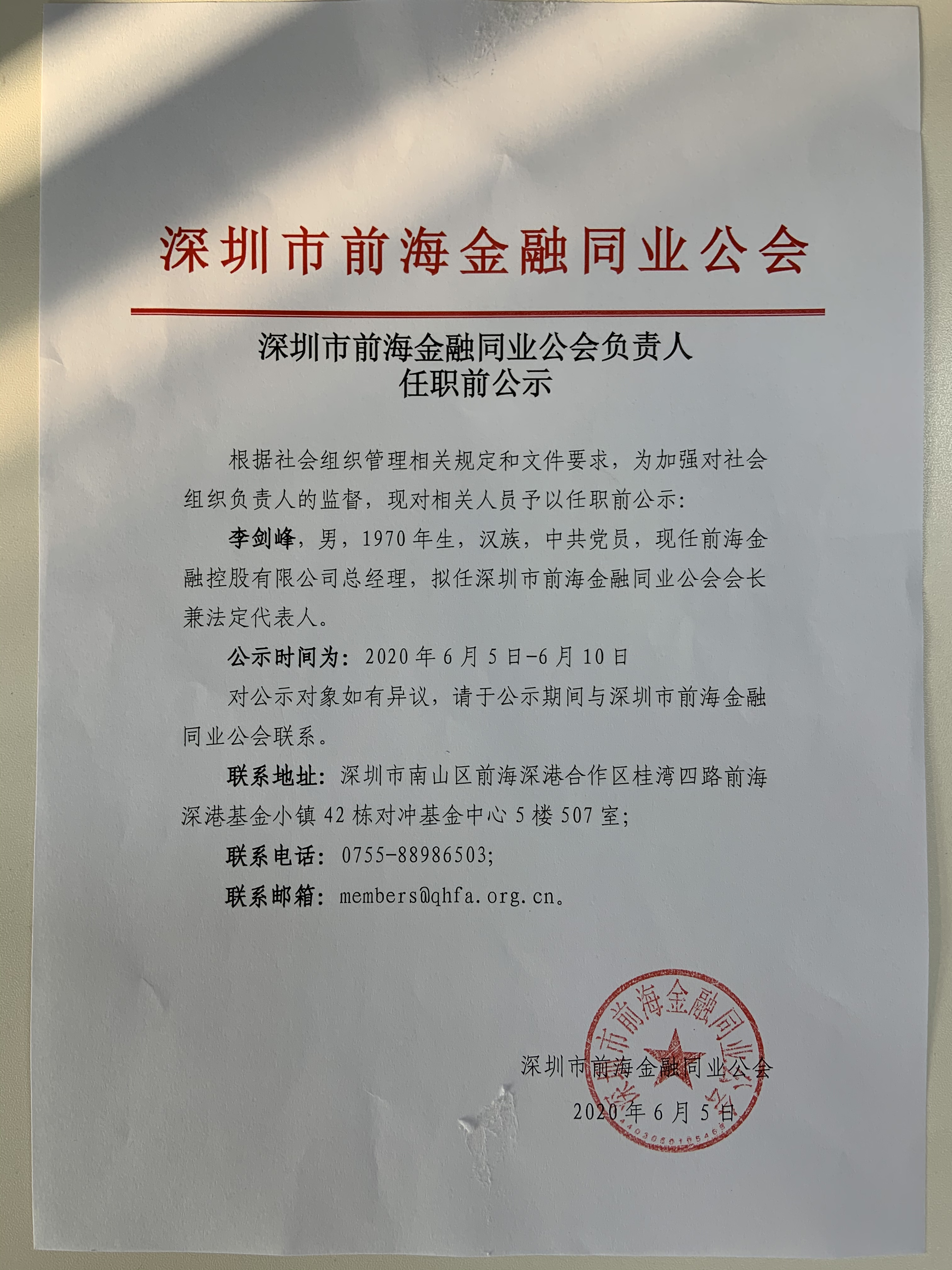 深圳市前海金融同业公会负责人任职前公示