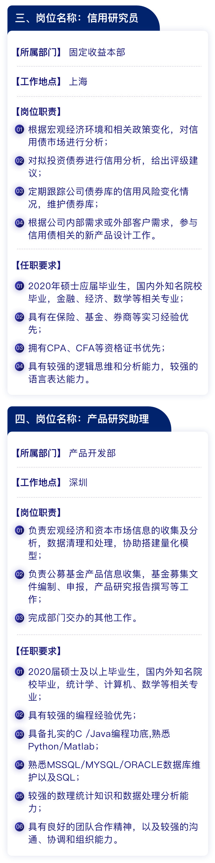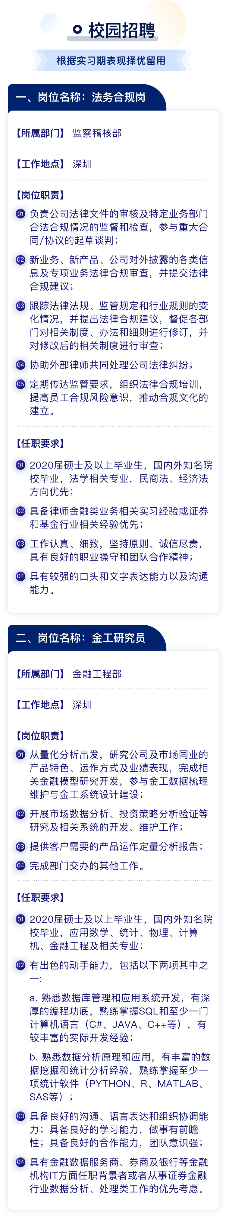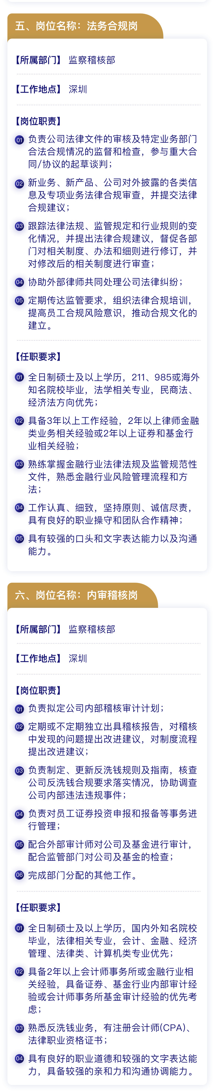 风险管理岗位(深圳),内核管理岗位(深圳),IT风险管理岗位(深圳),固定收益、资产管理风控合规专员(上海、深圳)。