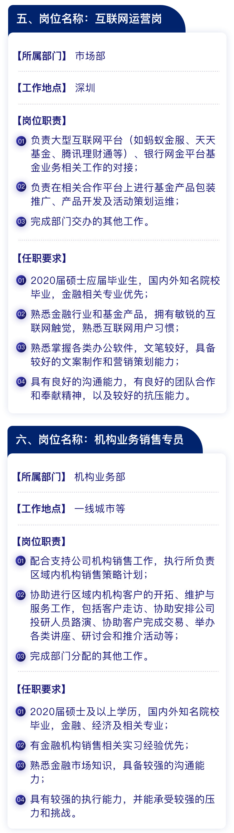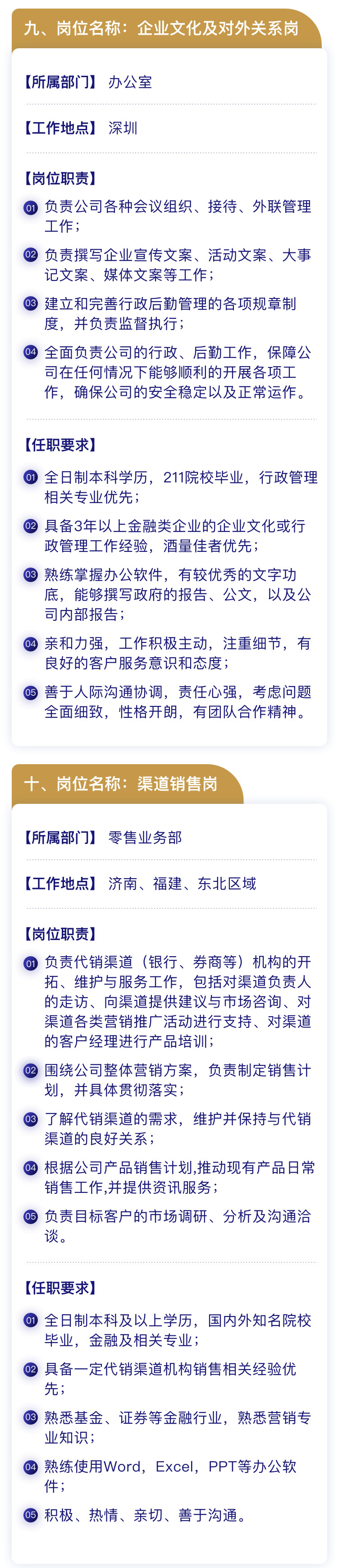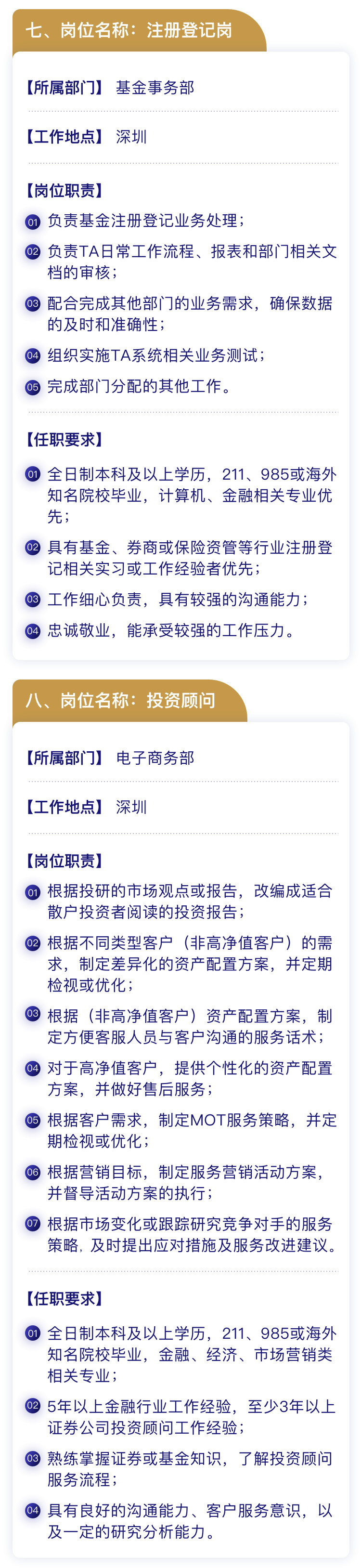 直销柜台岗、数据库管理员、IT开发项目经理、数据中心开发岗、法务合规岗、内审稽核岗、注册登记岗、投资顾问、企业文化及对外关系岗、渠道销售岗、机构业务部中台岗、校园招聘等。