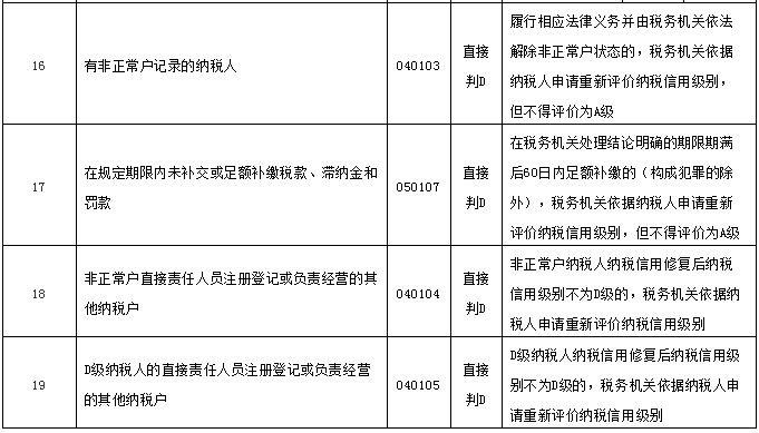 符合本公告第一条第(二)项、第(三)项所列条件的,纳税人可在纳税信用被直接判为D级的次年年底前向主管税务机关提出申请,税务机关根据纳税人失信行为纠正情况调整该项纳税信用评价指标的状态,重新评价纳税人的纳税信用级别,但不得评价为A级。
