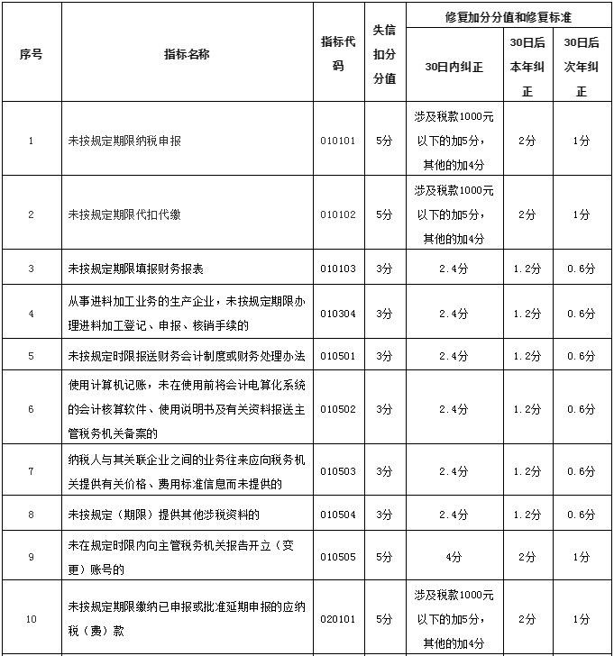(一)纳税人发生未按法定期限办理纳税申报、税款缴纳、资料备案等事项且已补办的,加分分值根据补办时间与失信行为被税务机关列入失信记录的时间间隔确定,在30日内、本年内、次年内纠正的,分别能挽回80%、40%、20%的扣分损失。对于未按规定期限申报或缴纳已申报的税款等事项,若涉及税款金额不超过1000元且纳税人能在失信行为被记录的30日内及时补办的,则补回100%的扣分分值。